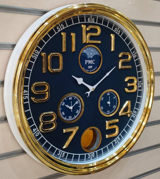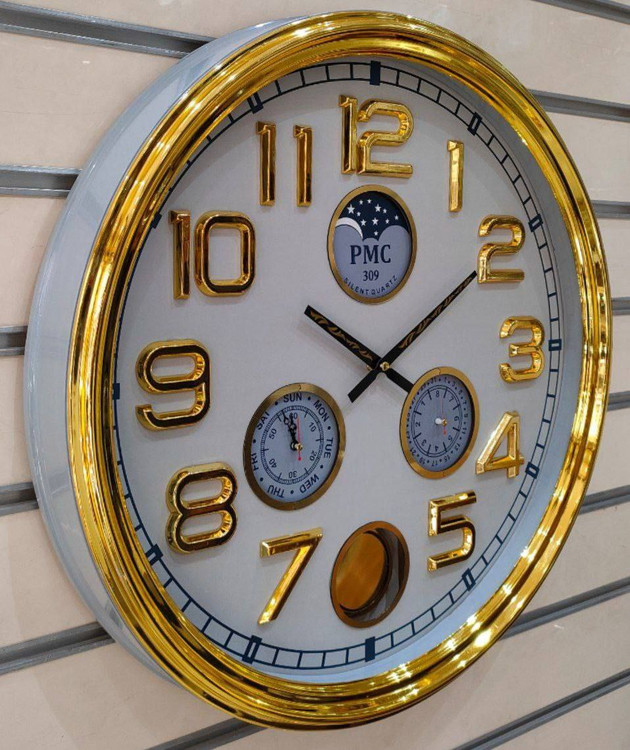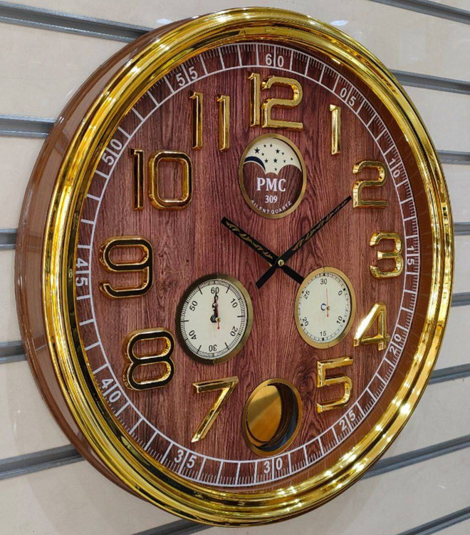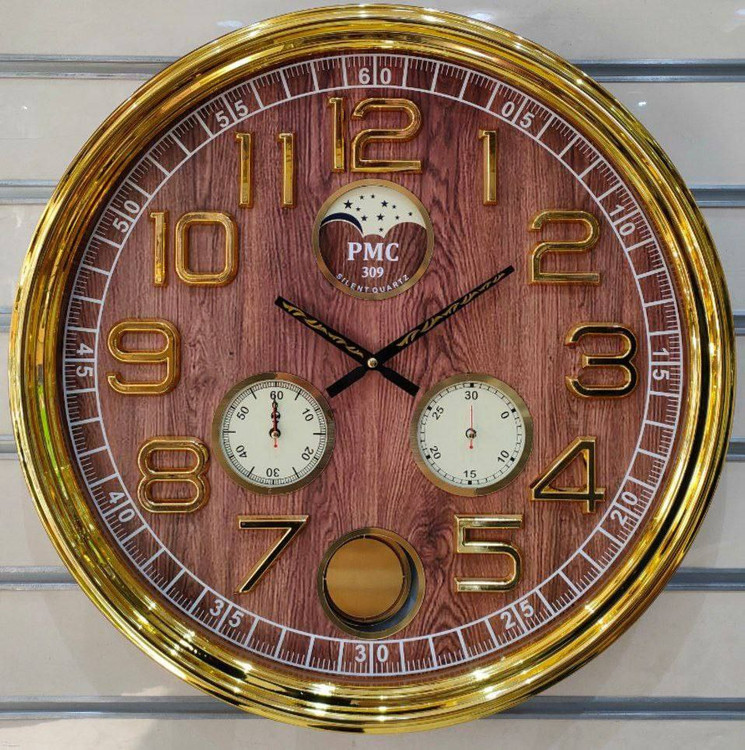 ساعت دیواری گرد پی ام سی 309 pmc قطر ۶۳ سانتیمتر دارای ۴ موتور مجزا دارای یک سال گارانتی موتور ارای سه رنگ قهوهای سفید و طوسی جنس بدنه پلاستیک اعداد آبکاری شده موتور آرامگرد بدون صدا