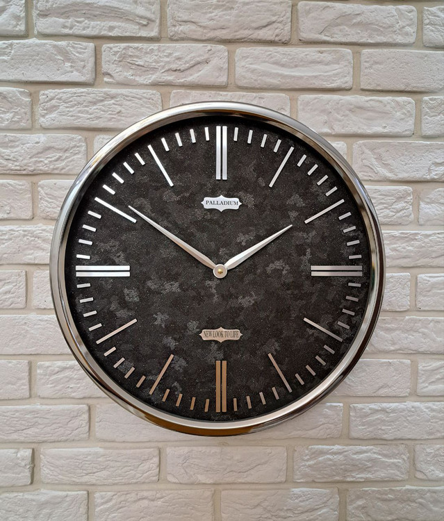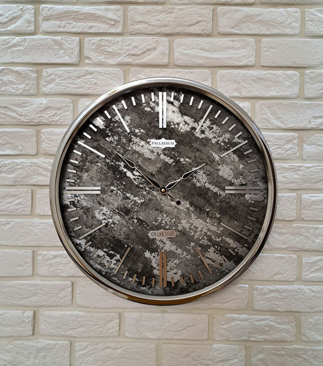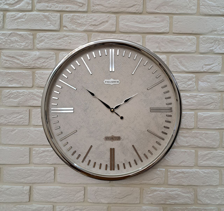 ساعت دیواری گرد فلزی پالادیوم ایکس ۲۰۰ x200 یک سال گارانتی موتور و موتور آرامگرد بدون صدا آبکاری سیلور با ضمانت قطر ۵۵ سانتیمتر صفحه تیره و روشن اعداد مولتی