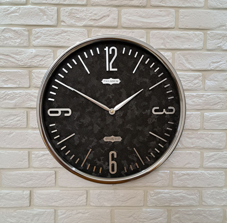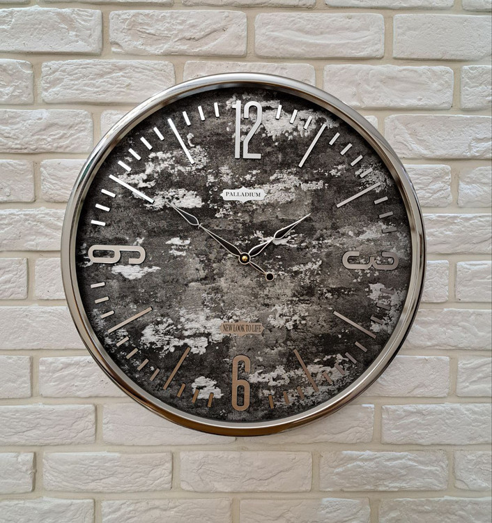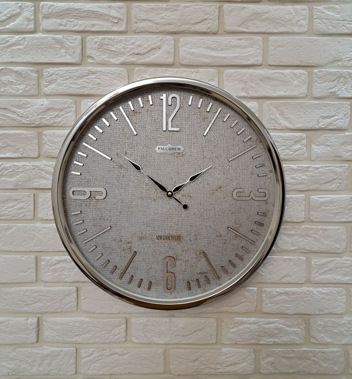 ساعت دیواری گرد فلزی پالادیوم ایکس ۱۰۰ نقرهای یا سیلور x100 silver دارای موتور آرامگرد بدون صدا یک سال گارانتی جنس بدنه فلزی با قطر ۵۵ سانتیمتر آبکاری شده سیلور جنس اعداد مولتی