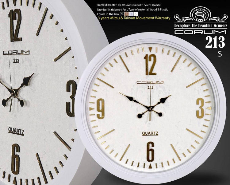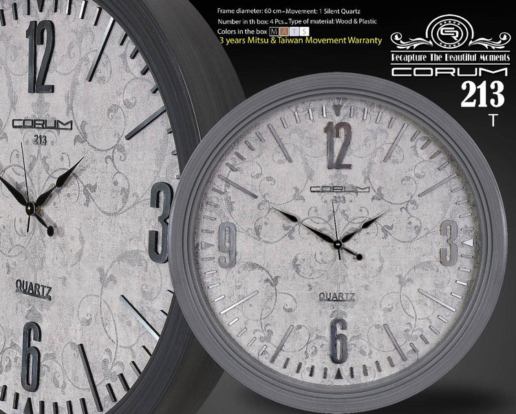 ساعت دیواری گرد کروم ۲۱۳ جنس بدنه پلاستیک جنس صفحه از کاغذ دیواری ترک قطر ۶۰ سانتیمتر دارای موتور آرامگر بدون صدا و درجه یک اعداد آبکاری شده