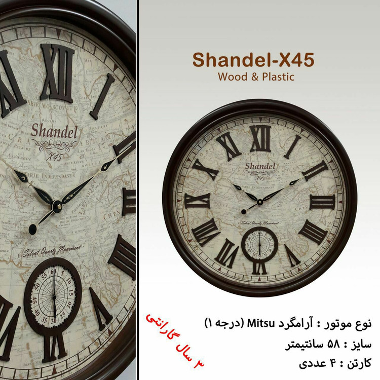 قطر ۵۸ سانتیمتر جنس بدنه پلاستیک جنس صفحه ام دی اف اعداد چوبی موتور آرامگرد بدون صدا دو موتور مجزا و ثانیه شمار جدا