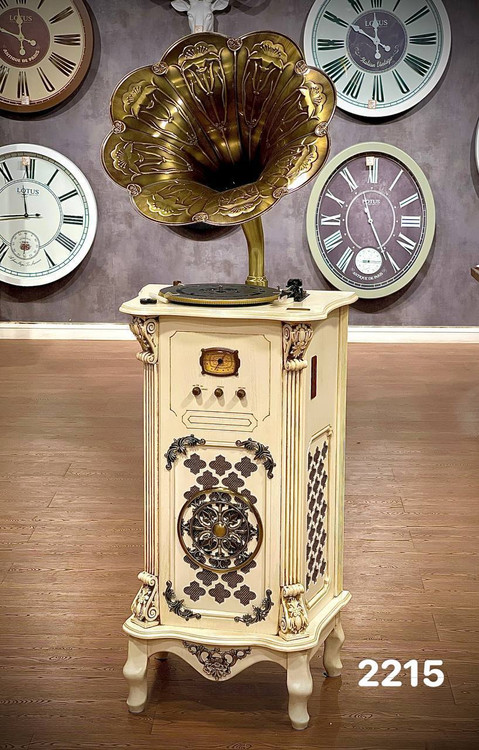گرامافون مبله مدل 2215 آنتیک کرم 4 کاره شیپور بزرگ فلزی پخش گرامافون (سه دور) گیرنده رادیو پخش بلوتوث پخش USB